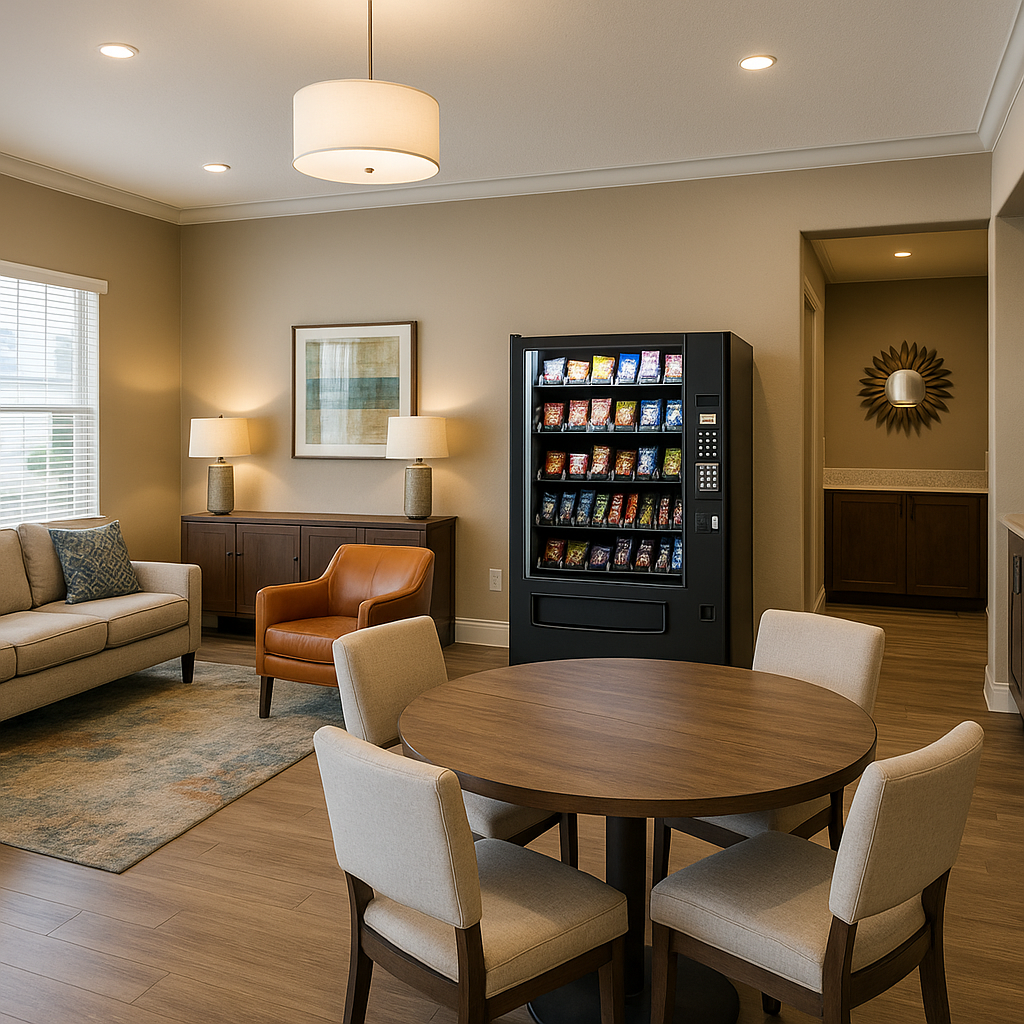 A living room with a round wooden table and four beige upholstered chairs, a beige sofa with a decorative pillow, a tan leather armchair, a wooden sideboard with two lamps, and a vending machine against the wall. There is a window with blinds, artwork on the wall, and a doorway leading to another area with a decorative mirror and wooden cabinets.